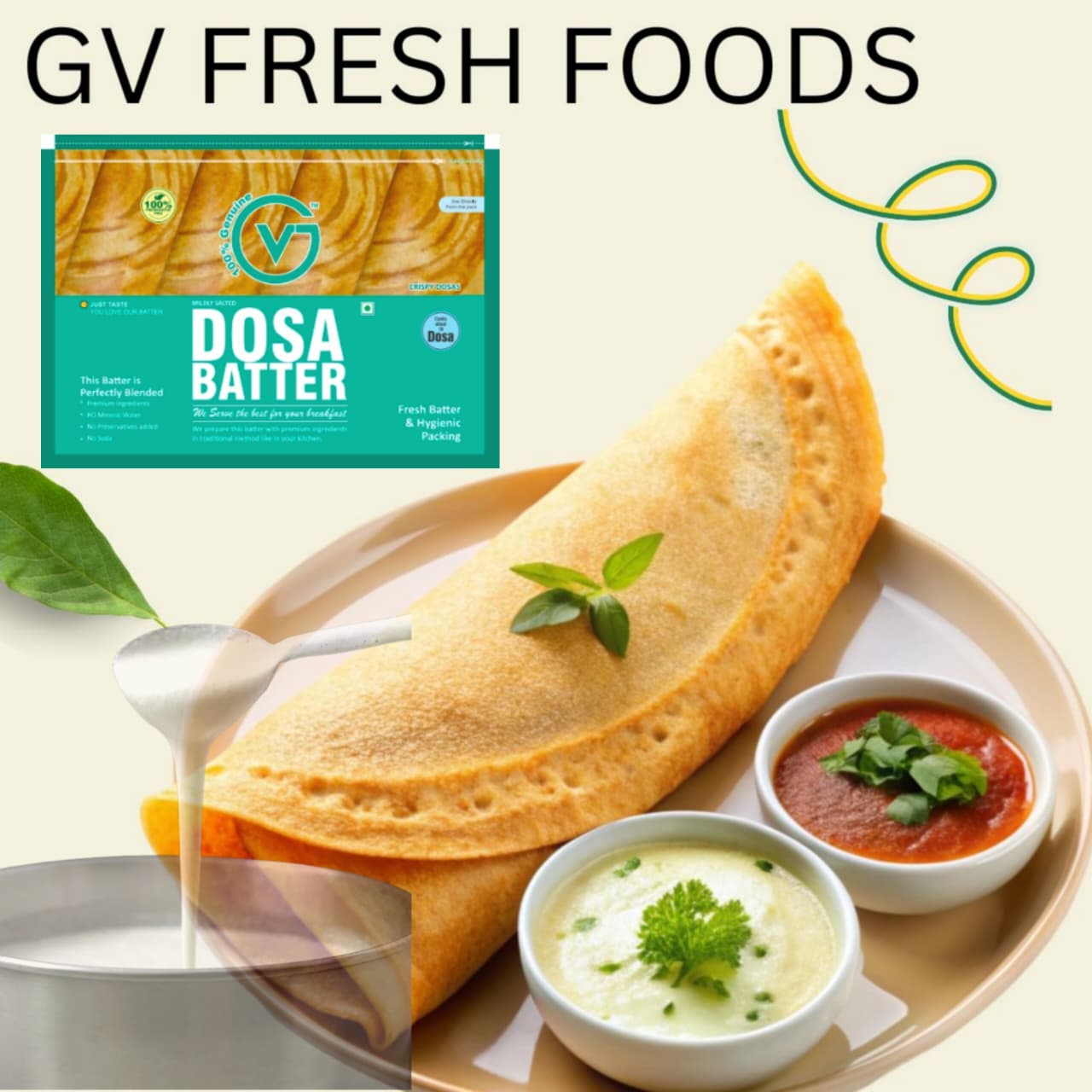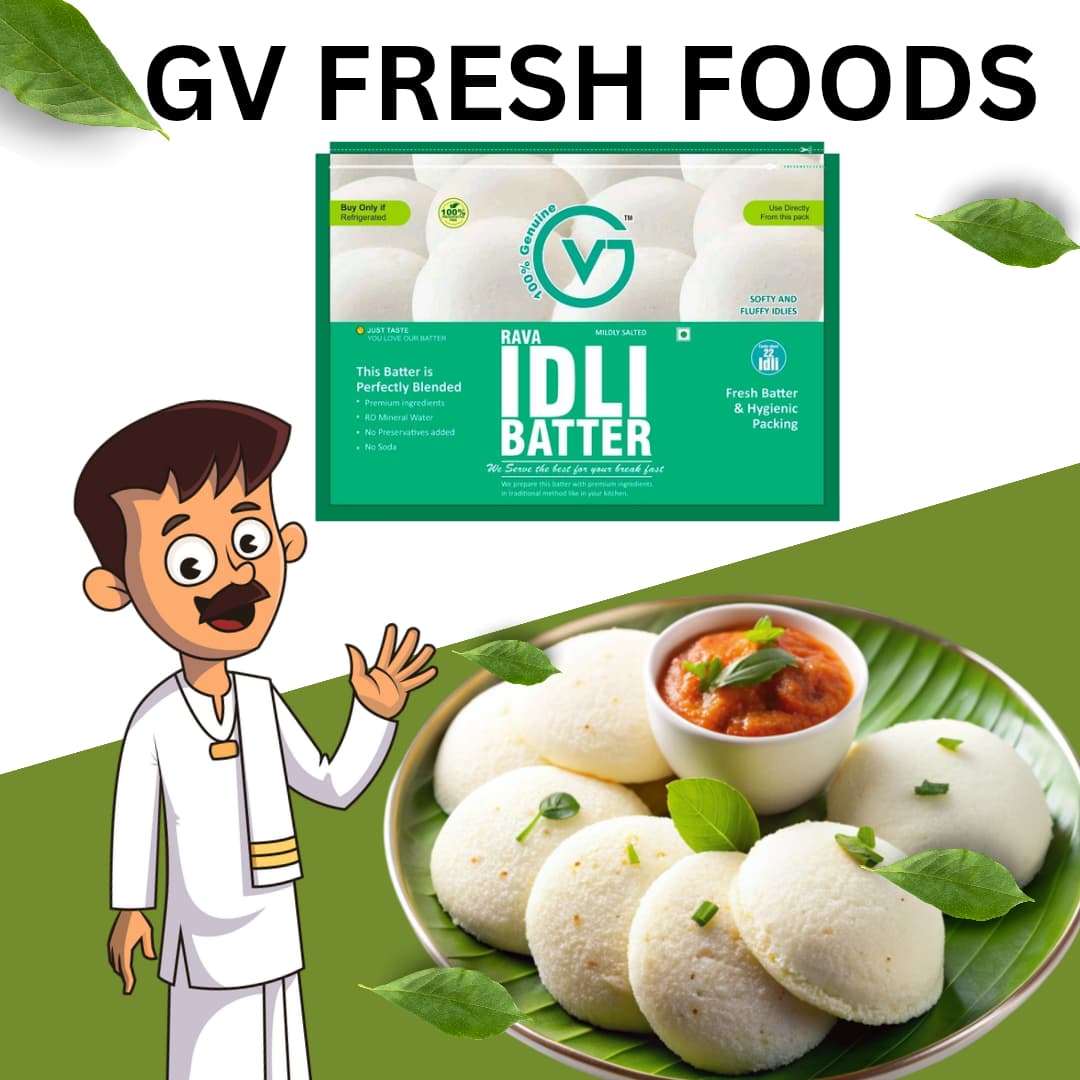 GV Fresh Foods is the number one brand for batters like idly and dosa batter started In 2020. We are supplying Idly Batter, Dosa Batter, Ragi Dosa Batter, Pesattu Batter, Wada Batter, and Millets Batters. The Batter is very fresh. No preservatives are added to the batters. We are selling pickles also. No colours were added to the pickles. Pickles are made in the traditional method and these are 100% preservative-free.